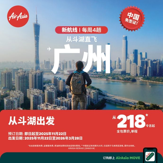 喜欢到中国旅游的朋友,这毫无疑问是一个好消息。亚航(AirAsia)宣布推出全新国际航线——“斗湖直飞广州”,首航将在2025年11月22日启程。