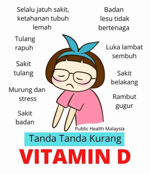 大马公共健康(Public Health Malaysia)在脸书专页指出,缺乏维生素D常会出现的症状包括:容易生病、身体虚弱、佝偻、骨痛、压力忧郁、身体疼痛、肌肉无力、创伤慢癒、背部疼痛、脱髮等。