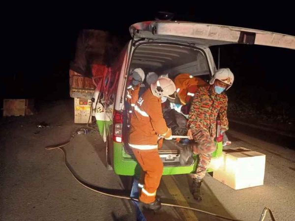 (京那巴当岸18日讯)恐怖车祸!一辆乘有两名男子的小型旅遊巴士从后猛撞前方的一辆10吨罗里,造成两人夹毙车内。