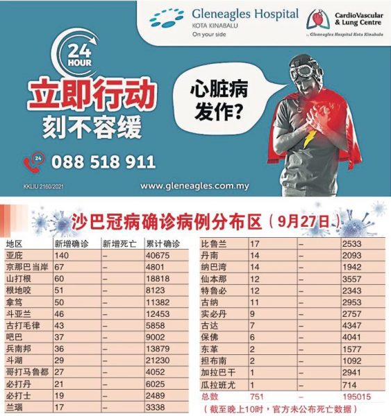 全国今天新增1万零959宗确诊病例,沙巴排第六。