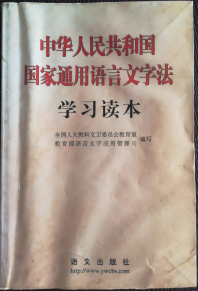 对于笔者提出来的问题,吕立民老师向来不以“我认为”、“我的看法”来回应。老师习惯性转身到身后的书架中,从数以万计的藏书中抽出一本书,照书直说。此书名为《中华人民共和国国家通用语言文字法》学习读本,原来这是中国关于语言文字所制定的专门法律,是绝对法律意义上的指导性说明,拥有足够的权威性及说服力。