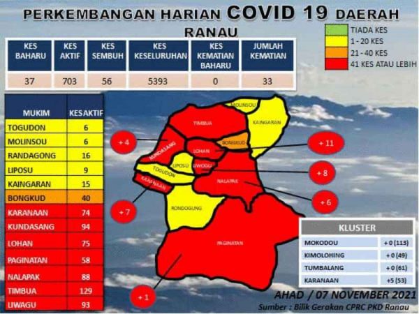 这些感染群即为已累计133例的摩豆可(Mokodou)、基摩罗兴(Kimolohing)累计49例、顿巴浪(Tumbalang)累计61例,以及昨天新增并累计52例的卡拉纳安(Karanaan)感染群。