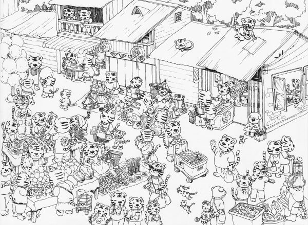 这幅精美画作是由沙巴着名画家陈俏绫所绘製,展现了新年热闹的本土斗磨景象。细看图内,你可以发现每隻老虎都有着活脱脱的形象,还充满本地特色,其中细腻的动作及服装更显其用心,比如用筷子吃麵与戴传统草帽等。