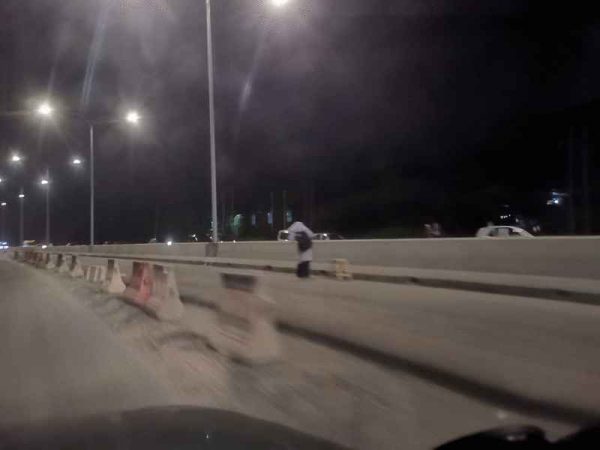 (亚庇12日讯)打里卜进行中的泛婆罗洲大道工程没有提供天桥,学生被逼冒险翻越路中央洋灰路墩越过马路。