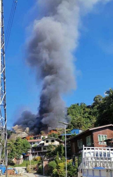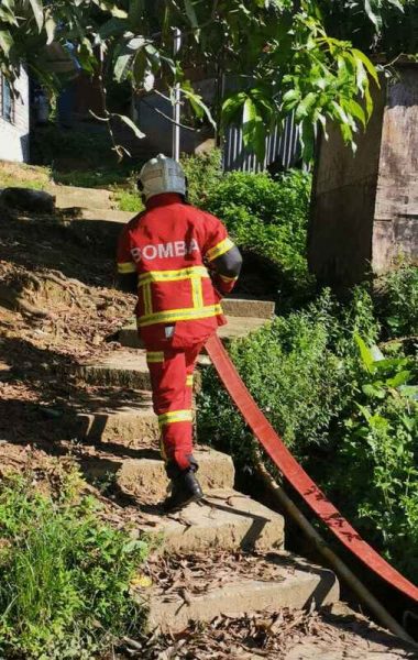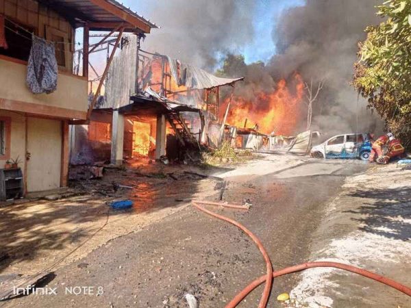(亚庇25日讯)亚庇市沙巴学院后面,依山而建的甘榜哥布逸(Kopungit)今早发生大火,5间房屋被大火吞噬,导致11户家庭顿失家园。