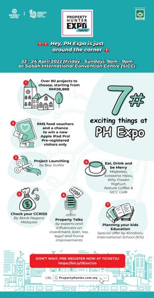 由东马的房地产网站龙头Property Hunter(PH)举办,东马最大型房地产展览PH Expo Hybrid 2022,将于即日起至周日(4月22日至24日),早上9点至晚上9点,在沙巴国际会展中心(SICC)盛大举办,共有超过40家房地产发展商,超过80个新的房地产项目参与其盛,民众欢迎踊跃出席参观。