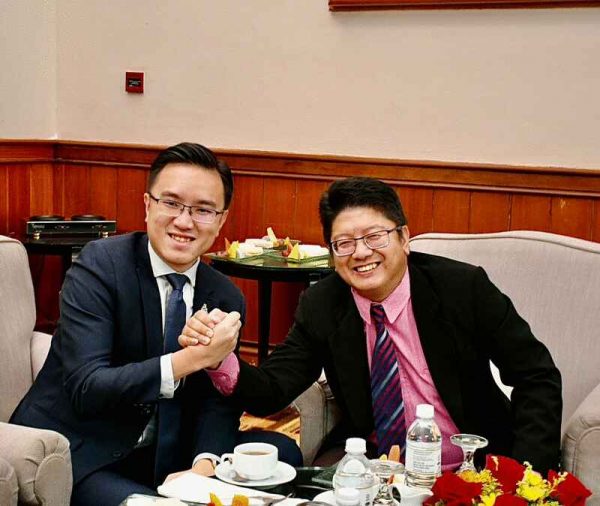 冯晋哲(左)认为依温当选新任民统党主席具正面及划时代的意义,为沙巴政治带来新气息。