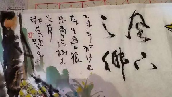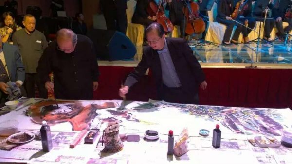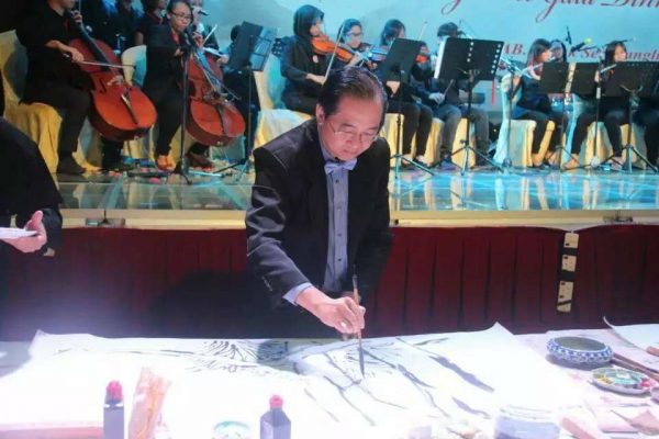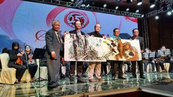 会上,拿督杨忠勇院长、陈湘荣老师及着名书画家林荣光老师一起受邀在晚宴典礼上联手挥毫,创作一幅以沙巴为主题的水墨丹青,将当日的庆典推向高潮。由杨院长精心绘制热带雨林中的树木,绿意盎然,一片生机;由林荣光老师大笔一挥的犀鸟和人猿,机灵可爱,憨态可掬;由陈湘荣老师信笔一挥的“风下之乡”草书题字,飘若浮云,矫若惊龙。三位艺坛大师当晚的联手创作,真可谓前呼后应,天衣无缝,为本州艺坛留下一段不朽的佳话。
