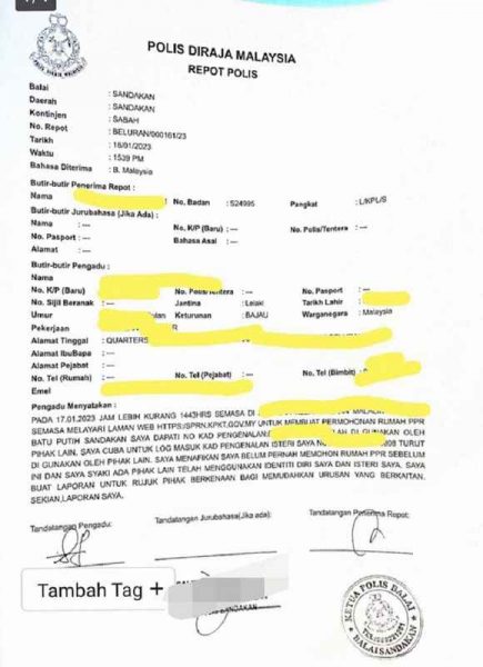 昨日(18日)一脸书社群流传一张报案书,内容指一名男子想要申请巴都布迪人民组屋时,却惊觉自己的身份证号码已遭他人冒用,再次在相关官网输入其妻子身份证号码后也出现相同情况。