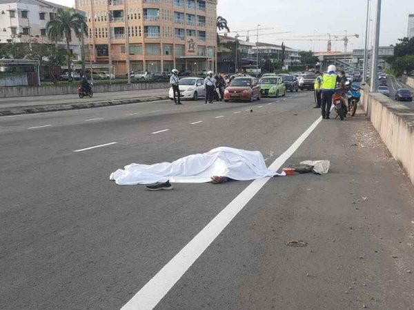 (亚庇15日讯)亿达高架桥公路昨日清晨发生死亡车祸,67岁的摩托男骑士魂断公路。