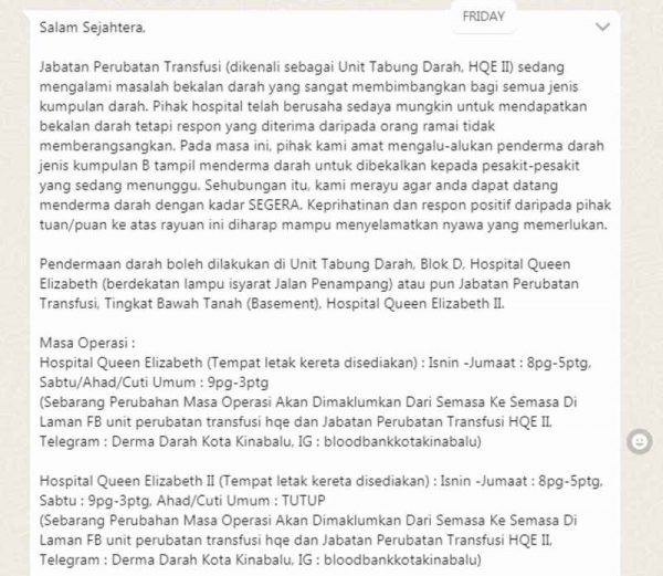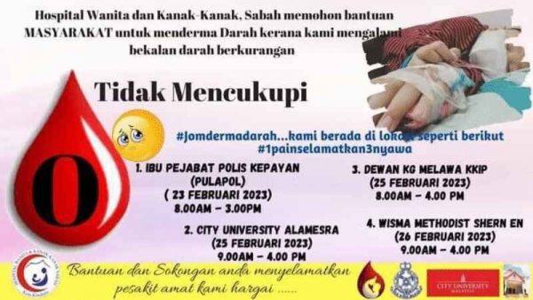 另外,沙巴妇孺医院同样发出血库告急的消息,该医院目前以O型血最缺,希望民众能够伸出援手。