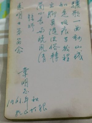 当我翻到“韦明志老师”那一篇,目光不禁停留在那刚健且飘逸的字体中,久久不愿翻篇。那是一首七言绝句:骊歌一曲动山城,如是坭痕第几程,立脚莫随流俗转,兰心长与晓风清。落款为:录赠惠明女弟留念,韦明志,1961年秋于山打根。诗歌前两句说明一生中辗转落脚各地,如今又是骊歌奏起离别之际。后两句则是对学生的勉励之词,语重心长,足见其良苦用心。