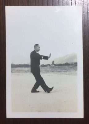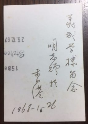 第二位把韦明志老师的笔蹟视若珍宝的是校友陈义成博士。他知道我为了撰文四处收集韦老师的资料,特别翻箱倒柜找出一张旧照片,后面就有韦老师的笔蹟。那是一张黑白人物照,韦老师穿着一身深色的西装,侧身摆着转腿推掌的姿势,伸缩开合,凝神聚气,煞是有型。照片的后方是韦老师的题字,上面写着:义成学棣留念,明志赠于香港,1968-1-26。