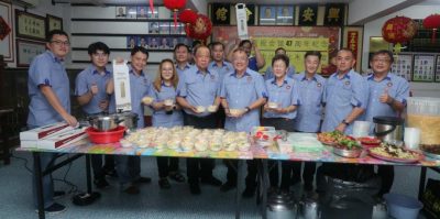 青年团现场准备浓郁香溢的叻沙汤,其原料来自古晋。同时也感谢名誉顾问曾金水主持切生日及同欢共庆会馆47岁生日。