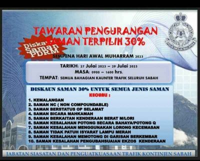 沙巴警方交通调查与执法组今天在脸书发出通告指出,今次的罚单折扣优惠为期3天,从明天(27日)至7月29日。