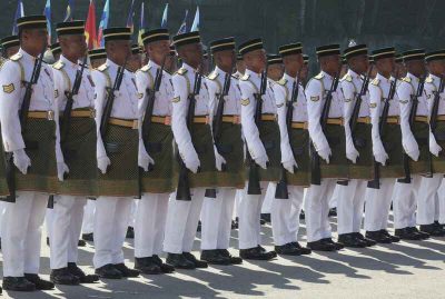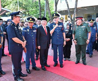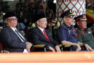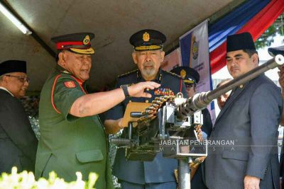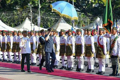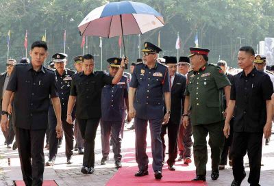 州元首敦朱哈在上午8时扺达会场后,上台接受军警及医务人员的敬礼,之后检阅由皇家马来军团官兵组成的的皇家仪仗队。