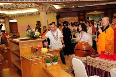 法会由佛光青年身穿各族服装,在梵音佛曲缭绕中,依次献上供品,掀开序幕。7个佛教团体各派代表于佛前献灯。接着,佛光山新马泰印教区总住持觉诚法师、东禅寺副住持满慧法师、佛光山沙巴禅净中心暨斗湖佛光寺监寺觉度法师三大师带领信众上供诵经祈福。
