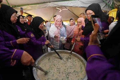 东姑阿兹莎在国家王宫随从和大马女公务员及公务员夫人协会(Puspanita)代表协助下完成料理,接着参与准备什锦粥,招待宾客和民众。