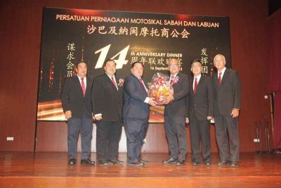 沙巴及纳闽摩托车商公会全体理事向来宾敬酒。