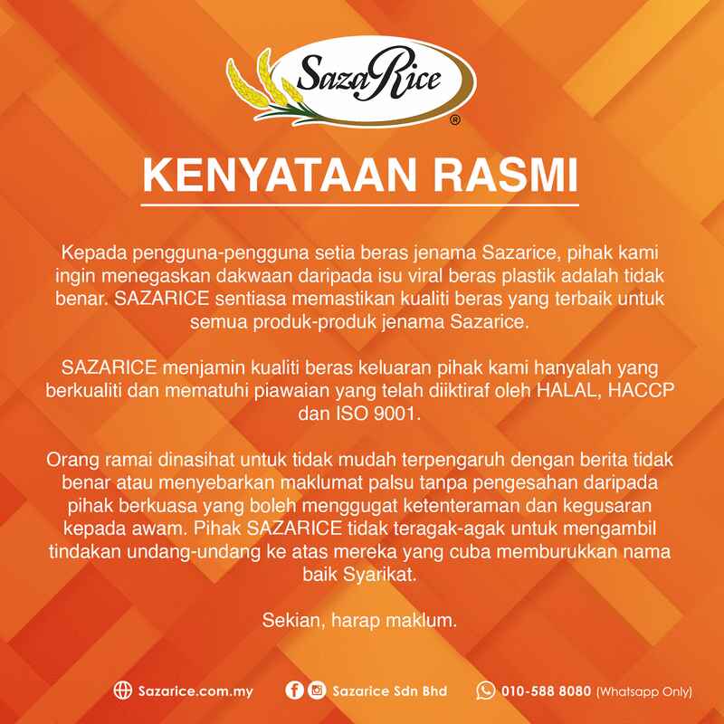 此外,国家稻米公司旗下子公司SAZARICE今日也严正声明,网络流传该品牌白米的指控为不实谣言。