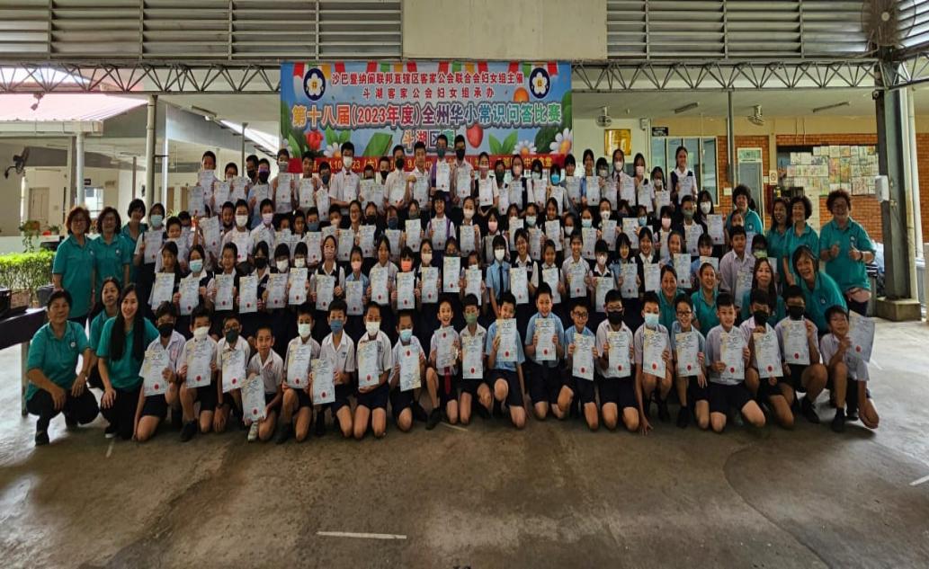 参与第18届(2023年度)全州华小常识问答比赛斗湖区赛的学生与客家公会成员合影。