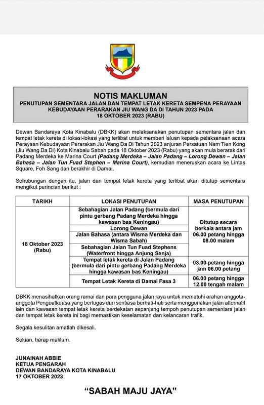亚庇市政厅促请道路使用者在有关道路关闭期间,遵守执法人员的指示,并使用替代路段和附近的停车位,以确保交通顺畅和道路安全。