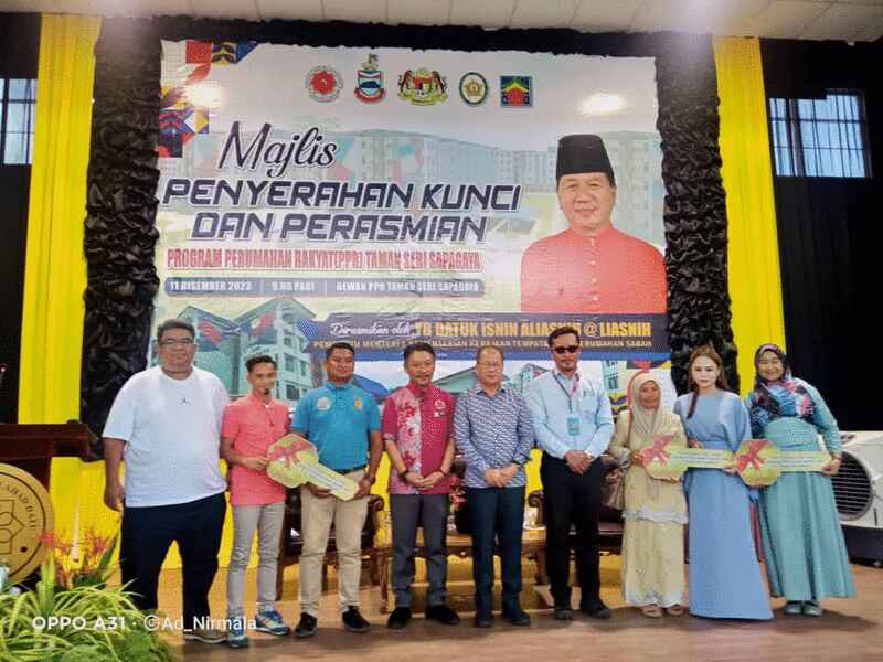 沙巴地方政府及房屋部助理部长拿督依斯宁週一(11日)在一项仪式上,移交斯里实巴加雅园人民组屋单位的钥匙给这批户主。