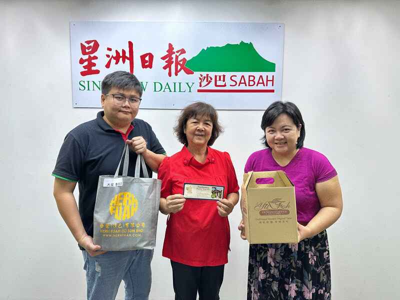 (亚庇30日讯)由沙巴星洲日报主办,丹南益和咖啡(Yit Foh Coffee)及合发(沙巴)有限公司盛情赞助的“龙厚礼啦!新春有奖竞赛”日前揭晓成绩后,大奖及佳作得主已陆续前来本报位于哥隆邦的办事处领取奖品。