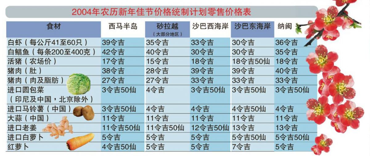 阿米占指出,农曆新年佳节价格统制计划是于正月初一以及前后4天执行,为期9天。被列为统制品的包括白虾(每公斤41至60只)、白鲳鱼(每条200至400克)、活猪、猪肉(花肉)、猪肉(上肉)、进口圆包菜(印尼及中国,北京除外)、进口马铃薯(中国)、大蒜、进口老姜、进口白萝蔔及红萝蔔。