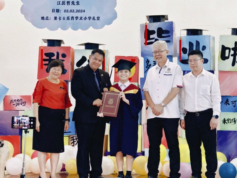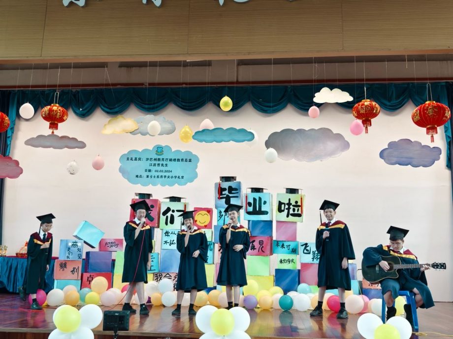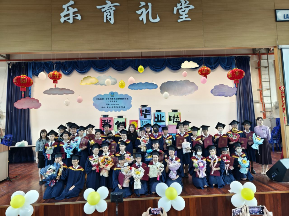 (亚庇3日讯)里卡士乐育华小逾百位六年级莘莘学子,今早穿着整齐的毕业袍,在礼堂出席毕业典礼。