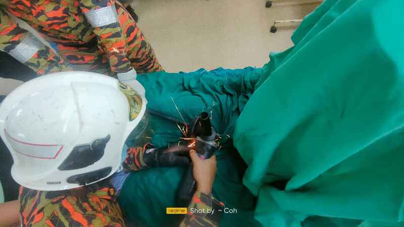 消拯员赶抵医院后,立即使用研磨机把插在伤者腹部外的铁支锯断,然后交给医务人员将伤者腹部内的另一部分铁支取出。