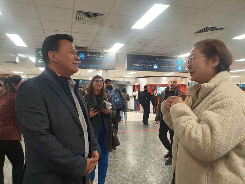 刘静芝一行人抵达匈牙利的布达佩斯李斯特·费伦茨机场时,受到我国驻匈牙利、斯洛维尼亚和北马其顿大使法兰西哥姆尼斯迎接。