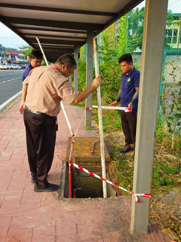 承包商直至今早依然未把沟渠盖板盖上,校方为避免再有学生坠洞受伤,只能自行在洞口处插杆及围上警示线,提醒学生在路过时要注意。