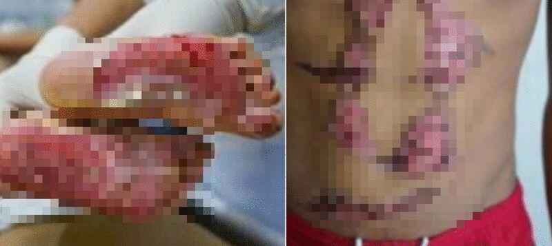 从照片中看到2名孩子的脚掌、耳背、胸、手臂、腿、腹部和背部都受到严重伤势。