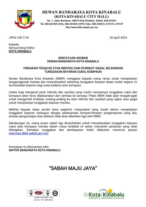 亚庇市民和商家受促尽快缴清拖欠的税款,遵守市政厅的规定。欲查询欠款的人,可浏览(eservices.dbkk.sabah.gov.my/)。