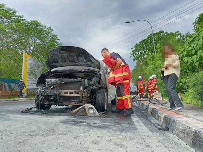 这起火烧车事故是于週三(8日)早上大约8时50分在丹绒巴都路,靠近Membedai政府诊所的路段发生,事主是一名56岁的妇女。
