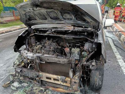 纳闽消拯局接到通报后派员赶往现场,迅速将汽车引擎燃起的火扑灭,避免大火将整辆汽车吞噬。