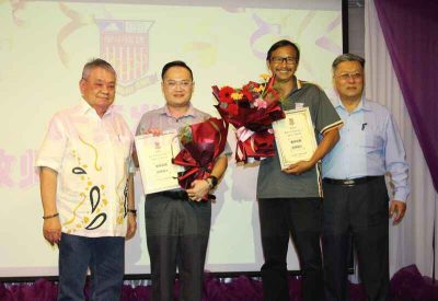 叶参也颁发长期服务奖予服务10年的教师廖荣文及许礼钟。