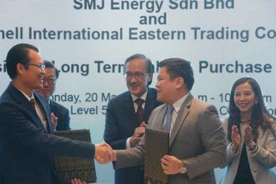 SMJ能源副主席(商业发展)费沙阿都拉曼代表SMJ能源有限公司,与东方蚬壳国际贸易公司商业经理阮进东签署原油货物销售及购买协议,涵盖沙巴在纳闽原油码头的原油货物。