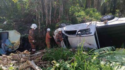 沙巴消拯局发言人在文告中指出,这起交通事故于今天早上在上述路段发生,两辆车发生碰撞后,皆翻覆在路旁的排水沟。