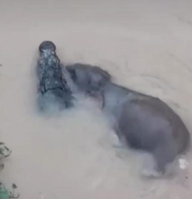 (山打根18日讯)近日,一段令人震惊的视频在社交媒体上迅速传播:在沙巴京那巴当河,一只鳄鱼咬住并拖拽着一头小象进入水中。