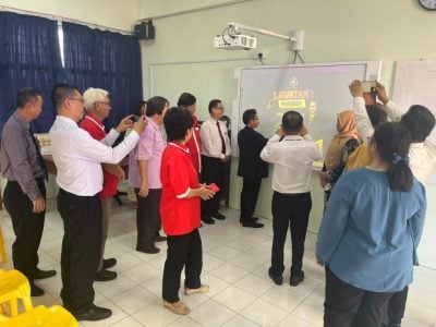 莱欣赛丁也参观乐育电脑室,了解电脑教学情况,并为数码电子楼的电子白板主持启用仪式。