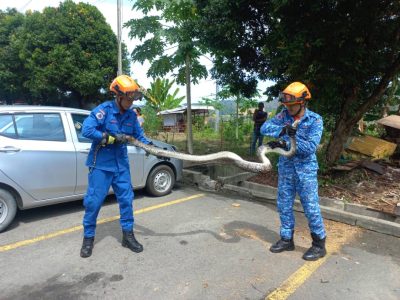 亚庇民防部队行动控制中心发言人指出,最近一起蟒蛇出没事件是于周五(28日)在实邦加的Seri Maju园发生。当地居民在杂物堆中发现一条体型硕大的网纹蟒(Ular sawa batik),遂召来民防部队处理。