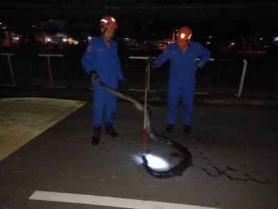 根据亚庇民防部队上载到脸书的视频,捕蛇过程惊险。4名队员看到蟒蛇逃入杂物堆旁的沟渠后,其中一名队员大力拉扯蟒蛇的尾巴。蟒蛇试图反扑,但是被其余队员用捕蛇夹制伏。