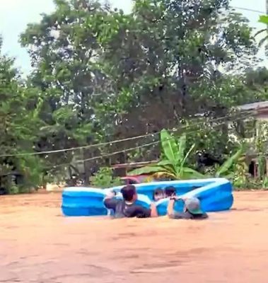 居住在东贡岸的亚兹里尼科朱潘占接受《星报》访问时说,当大水淹没家园,水位持续高涨时,他和家中男丁便利用这个长约2.74米,宽约1.5米的充气泳池,先把6个孩子包括1岁婴儿和两岁的女儿送到更高的地方。
