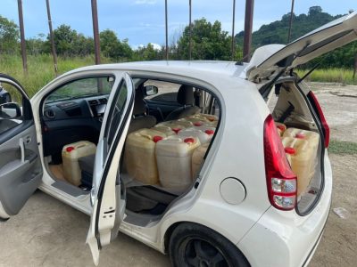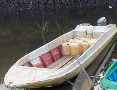 在执法人员出现时,一名男子立刻跳海逃入沼泽地。虽然如此,执法人员还是在现场扣押161个容量为25公升的汽油桶,总计4025公升汽油,也起获以下物品: