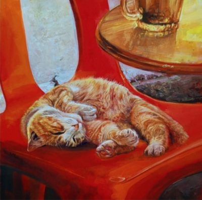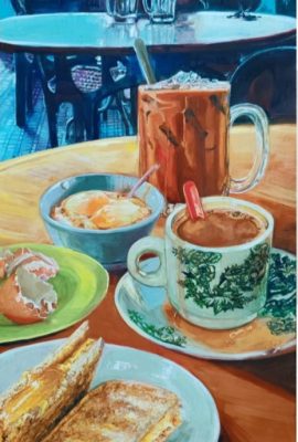 “Lazy Afternoons” 中的小猫窝在红色的塑料椅上,这些无法忽视的存在已刻在所有人的心里,成为茶餐室的标配。“Kaya Conversations” 画的是马来西亚的经典早餐组合,一杯热咖啡,一颗半熟蛋,再来一个加椰烤面包,是所有人心中不可替代的早餐。而“Sunday in kopitiam” 从画作名开始就体现出大马独有的语言体系,画作从茶餐室内出发,喧闹的早市记录了人们最熟悉平常的星期日。