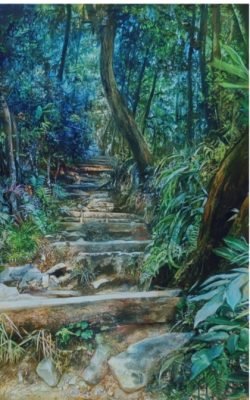 此外,当她抵达学校的时候,车旁总有一盆白色的花种盛开。她说,她会捡起掉在地上的花去闻它的清香,这样的回忆使她创作了“The Scent of The Way to School”这幅画。“Trail of Serenity” 绘出林间小路的景象,是彭艾玛在空闲的时候去爬山所记录下来的所见。除了绿叶,她也在画中画上3个不带绿色的生物。它们藏匿在画中,既保留大自然最原本的模样,也增加画作的互动性。