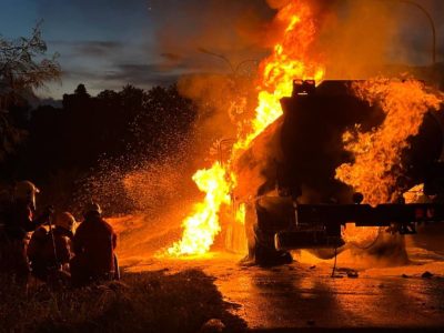 (拿笃13日讯)一辆装载1万公升的柴油油槽车在Palm Height花园附近的交通岛起火燃烧,火势惊人。大火持续狂烧近8小时才得以扑灭,所幸没造成人命伤亡。