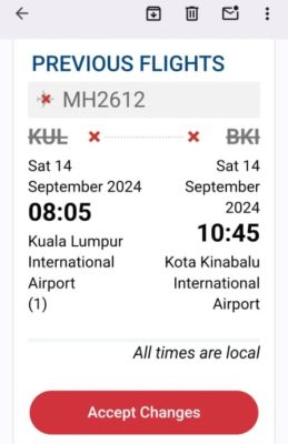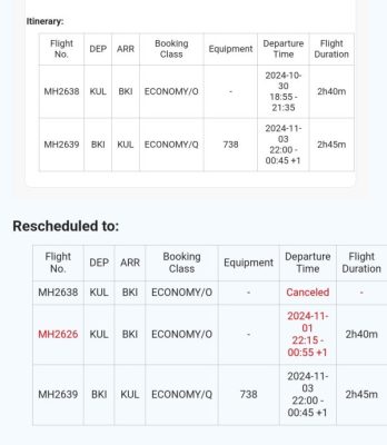 他说,他接到马航通知原订今年10月30日从吉隆坡飞往亚庇的航班已取消,新的出发日期为11月1日。至于11月3日回程航班则没有更动。